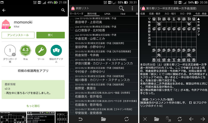 このアプリは、ネット上で無料中継されている棋譜を読み込み簡単に再生できるところである。プロのタイトル戦が解説付きでみられる。