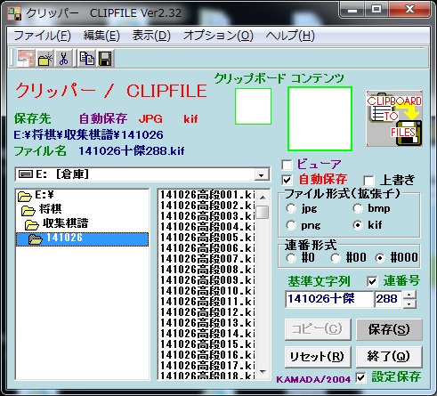 以前紹介した「Clipfile」を使うことにより棋譜ファイルが自動的に連番付きで保存される。